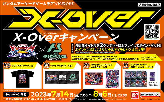 ガンダムアーケードゲーム連動!ゲームプレイでオリジナルアイテムがもらえる「X-Over(クロスオーバー)キャンペーン」を7月14日(金)よりスタート!対象タイトルをプレイして、「Tシャツ」「プロモーションカード」などのオリジナルアイテムと交換しよう!