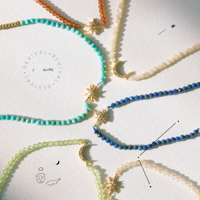色鮮やかなカラーストーンを連ねて仕上げたブレスレット。ダイヤモンドをあしらった太陽や月、星のモチーフを添え、煌めくデザインに仕上げました。