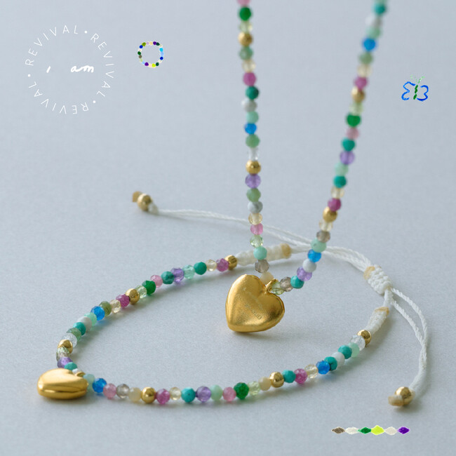 約14種類もの色とりどりな天然石ビーズを連ね、ぷっくりとしたハートのチャームを添えた、ブレスレットとチョーカー。チョーカーは長さを2段階に変えられので、ネックレスとのレイヤードもおすすめです。