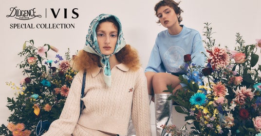 「DILIGENCE PARLOUR」のデザイナーが特別に書き下ろした、「VIS」とのオリジナルモチーフをあしらったスウェット、ニット、ニットスカート、バッグの全4型を展開。