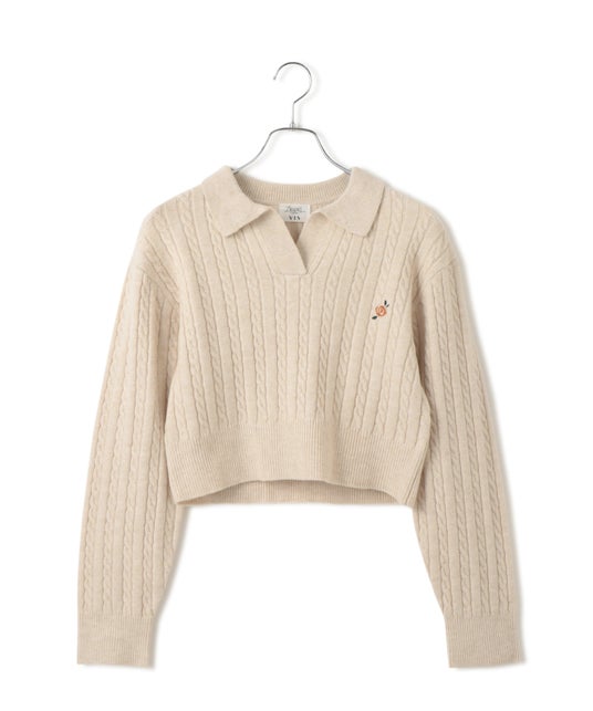 首元は、ポロ襟で抜け感を演出。「ローズ刺繍ポロケーブルニットスカート」とセットアップで着用できます。