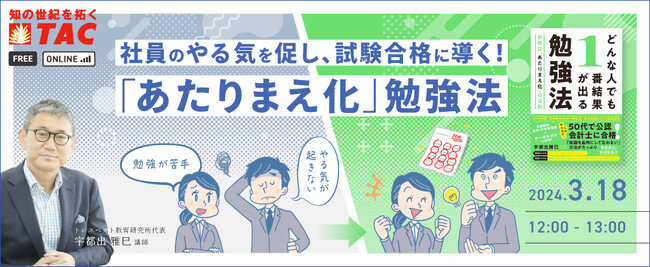 公認会計士や税理士など、多くの国家資格や検定試験の受験指導などの教育事業を展開しているTAC株式会社(東京都千代田区、代表取締役:多田敏男)は、法人向け人材教育部門から、企業の研修ご担当者様に向け、社員のやる気を促し、試験合格に導く!「あたりまえ化」勉強法セミナーを2024年3月18日(月)に実施します。