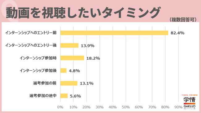 就職に関する情報収集で動画を視聴したいタイミングは、「インターンシップへのエントリー前」が82.4%で最多となりました。他の項目を大きく引き離す結果となっており、応募行動をとる前により具体的な情報を得たいという意向がうかがえます。