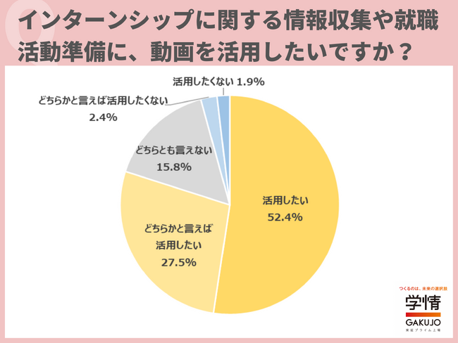 インターンシップに関する情報収集や就職活動準備に、「動画を活用したい」と回答した学生が52.4%に上りました。「どちらかと言えば活用したい」27.5%を合わせると、8割に迫る学生が、就職活動準備に動画を活用したいと考えていることが分かります。「テキストより、多くの情報を得ることができる」「企業の雰囲気を知りたい」「就職活動準備以外の情報収集でも、動画を活用することが多い」といった声が寄せられました。