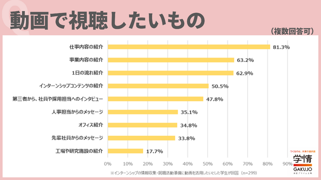 動画で視聴したいものは、「仕事内容の紹介」が81.3%で最多。次いで、「事業内容の紹介」63.2%、「1日の流れ紹介」62.9%、「インターンシップコンテンツの紹介」50.5%が続きました。「仕事内容を具体的に知れると、自身に向いているかイメージしやすい」「入社後に活躍できそうかを具体的にイメージしたい」「実際に入社した際の仕事内容や1日の流れを知りたい」といった声が上がっています。