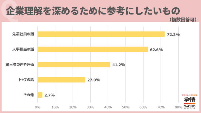 企業理解を深めるために参考にしたいものは、「先輩社員の話」が72.2%で最多。次いで、「人事担当の話」62.6%、「第三者の声や評価」41.2%が続きました。「入社後、先輩上司になる方の話を聞きたい」「実際に働いている人の声が、1番企業のリアルを知れると思う」といった声が上がっています。