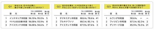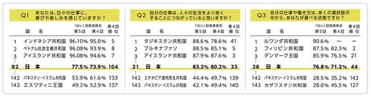 ・3つの設問に関して「はい」と回答した日本の世界ランキングは、Q1が104位から92位、Q2が33位から21位、Q3が44位から28位と、第4回目と比較してそれぞれ上昇した。