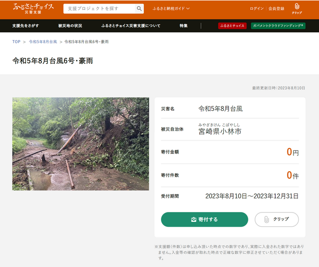 国内最大級のふるさと納税総合サイト「ふるさとチョイス」を企画・運営する株式会社トラストバンク(本社:東京都渋谷区、代表取締役:川村憲一、以下「トラストバンク」)は8月10日、ふるさと納税で被災自治体の災害支援に寄付できる仕組み「ふるさとチョイス災害支援」( https://www.furusato-tax.jp/saigai/ )で、台風6号により被災した宮崎県小林市の「災害時緊急寄付申込みフォーム」を開設しました。寄付金は全額、被災地の復旧・復興に使われます。