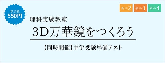 株式会社増進会ホールディングス(Z会グループ)のグループ会社、株式会社栄光(本社:東京都千代田区 代表取締役社長:下田勝昭)が運営する進学塾・栄光ゼミナールは新小学2~4年生(現小学1~3年生)と保護者を対象に、理科実験教室「3D万華鏡をつくろう」を、2024年2月23日(金・祝)・24日(土)・25日(土)、3月2日(土)・3日(日)に開催します。鏡を使った3D万華鏡作りに親子で取り組み、ものの見え方を予想・実際に観察します。中学入試でよく出題される「光の反射」について、自らの体験を通じて興味を持って学ぶことができます。また、同時開催の「中学受験準備テスト」では、中学入試の出題傾向を意識した発展的な問題を出題します。お子さまの現在の学習状況と今後の課題の把握にご活用ください。