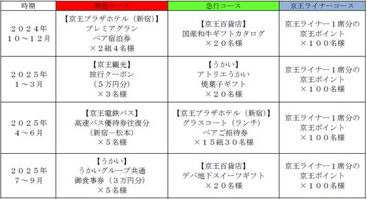 「特急コース」「急行コース」「京王ライナーコース」の3コースを用意し、応募したコースのオススメ品を毎月抽選で100名様以上にプレゼントします。