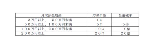抽選対象月の京王NEOBANK口座の月末預金残高が3万円以上、かつ、抽選対象月にWebエントリーページからご応募いただいた方が抽選対象になります。また、月末預金残高が多いほど応募口数が増加し、当選確率も上がります。