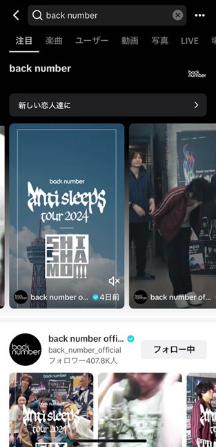 「検索特設ページ(Search Hub)」を公開しました。TikTokアプリ内で「back number」を検索すると、この検索特設ページが表示されます。本検索特設ページでは、ハッシュタグ「#新しい恋人達に」を使用したさまざまな動画投稿を閲覧することができます。