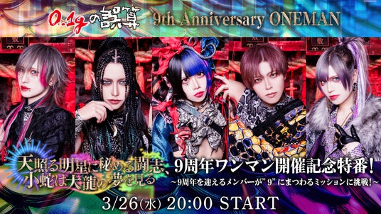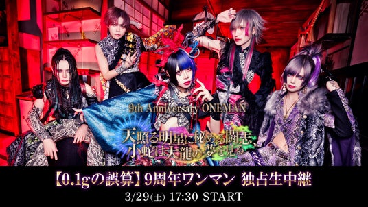 ”日本一バズる”ヴィジュアル系バンドとして知られる「0.1gの誤算」の、活動9周年を記念した公演「天照る明星に秘める闘志、小蛇は大龍の夢を見る」が、2025年3月29日(土)豊洲PIT(東京・江東区)にて開催される。ニコニコ生放送では豊洲PIT公演の模様を、独占生中継いたします。