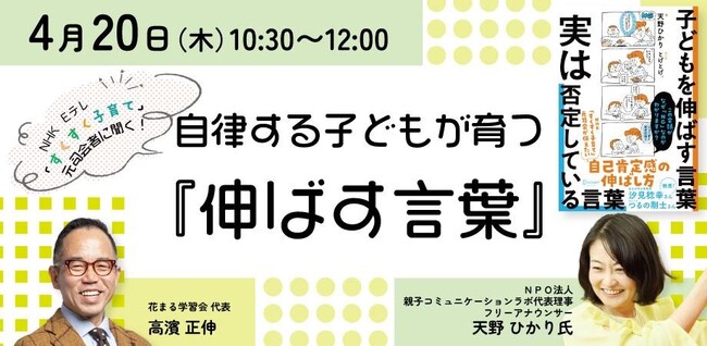 株式会社ディスカヴァー・トゥエンティワン(本社:東京都千代田区、取締役社長:谷口奈緒美)刊行の『子どもを伸ばす言葉 実は否定している言葉』著者の天野ひかりさんと、花まる学習会代表の高濱正伸さんの対談イベントの開催が決定しました。テーマは「NHK『すくすく子育て』元司会者に聞く!自律する子どもが育つ『伸ばす言葉』」。花まる子育てカレッジの企画で、オンライン開催されます。