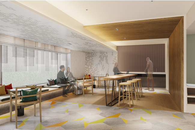 一面の窓から降り注ぐ木漏れ日を感じるランドリーラウンジ。中央にはぬくもりのある天然木のカウンターテーブルを、窓際には縁側を思わせるベンチソファを配しました。天井や壁の一部には、計画的に植林・生育されたサステナブル木材を使用し、ローテーブルには農業廃材の再生材を採用するなど、環境に配慮した素材を選定。ランドリーを待つだけでなく、客室以外の心地よいワークスペースやコミュニケーションスペースとしてご利用いただけます。