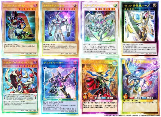 テレビアニメ「遊☆戯☆王」シリーズの歴代主人公たちが持つエースモンスター8種(「ブラック・マジシャン」、「E・HERO ネオス」、「スターダスト・ドラゴン」、「No.39 希望皇ホープ」、「オッドアイズ・ペンデュラム・ドラゴン」、「デコード・トーカー」、「セブンスロード・マジシャン」、「ギャラクティカ・オブリビオン」)から好きなエースモンスターの「クロニクルカード」(フルスターライト加工/リムカラー・銀/ネームカラー・金)を1枚お選びいただけます。