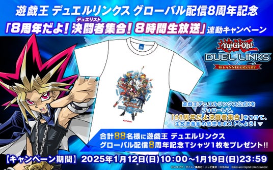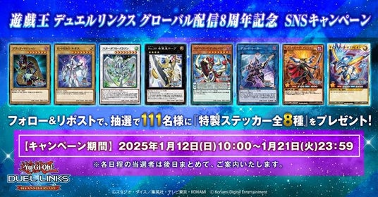 株式会社コナミデジタルエンタテインメントは、モバイル・PCゲーム『遊戯王 デュエルリンクス』にて、グローバル配信8周年を記念したゲーム内キャンペーンを2025年1月12日から開始することをお知らせします。