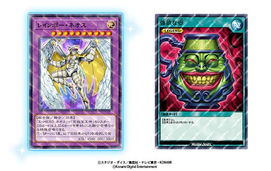 「レインボー・ネオス」(SPEED/エクストラプレミアム加工)と「強欲な壺」(RUSH/プレミアム加工)をそれぞれプレゼント!