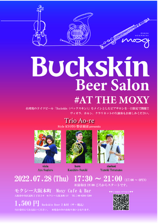 モクシー大阪本町(大阪市中央区瓦町2-2-9 / 総支配人 田口健)はこの度、株式会社日本サルベージサービスが正規代理店を務める台湾発のドイツビール「バックスキン(Buckskin:柏克金)」とStyle KYOTO管弦楽団のヴィオラ・ホルン・クラリネットによる生演奏を楽しめる『Buckskin Beer Salon #ATTHEMOXY』を2022年7月28日(木)に開催いたします。