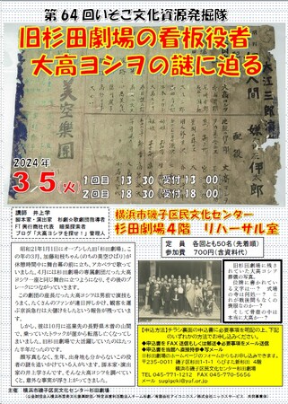 【タイトル】第64回いそご文化資源発掘隊「旧杉田劇場の看板役者 大高ヨシヲの謎に迫る」