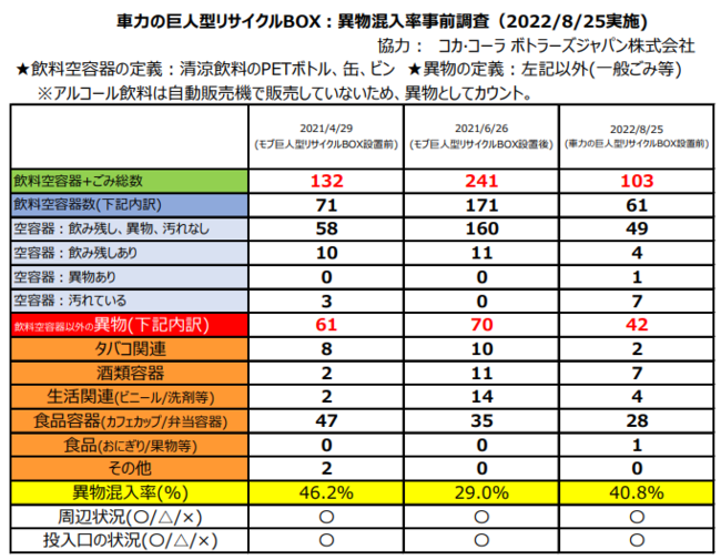 CHANGE FOR THE BLUE in 大分実行委員会では、昨年6月9日より11月22日まで「巨人型リサイクルBOX」を同箇所に設置しており、設置前後で異物混入率(内容物に占めるごみなどの異物の割合)がどのように変わったかを記録しています。昨年は巨人型リサイクルBOXを設置することで、異物混入率をおよそ16ポイント削減できました。今回も「車力の巨人型リサイクルBOX」の設置に際し事前調査を行った結果、巨人型リサイクルBOX設置前ほどではないものの、40.8%と高い異物混入率となりました(当団体の調査ではリサイクルBOX内の異物混入率の平均数値35.3%)。「車力の巨人型リサイクルBOX」の設置によって、県内外・観光客の皆様にリサイクルBOXへの異物投入ゼロ・散乱ごみ発生抑制を通じて海へのごみ流出防止に繋がれば幸いです。