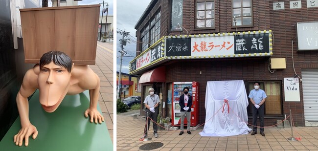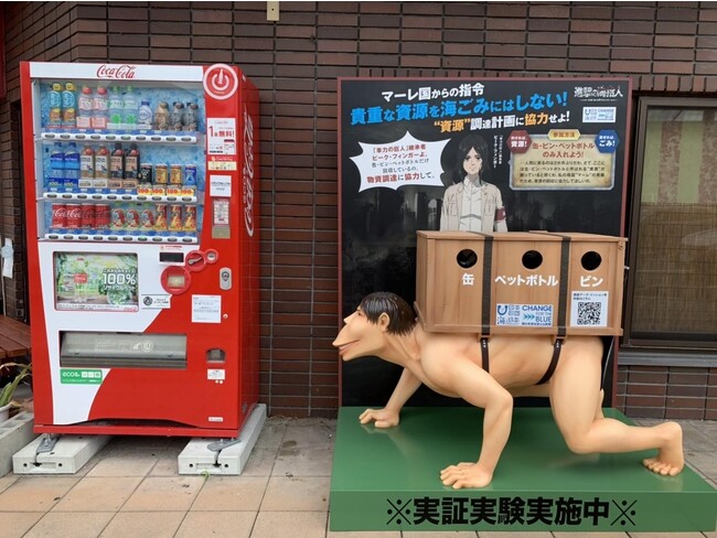 CHANGE FOR THE BLUE in 大分実行委員会は、コカ・コーラ ボトラーズジャパン株式会社と連携し、TVアニメ『進撃の巨人』に登場する「車力の巨人」を模った自動販売機専用空容器回収リサイクルボックス(以下、リサイクルBOX)を、日田駅そば・大龍ラーメン 蔵龍前のコカ・コーラ社自動販売機横に設置しました。取り組みを記念し、同日11時より、大龍ラーメン 蔵龍前にて完成披露除幕式を行いました。日頃リサイクルBOXの存在を意識しない方々にも目を向けてもらい、正しい利用を通じてOXへの異物混入状況の改善を図りました。「車力の巨人型リサイクルBOX」の設置は、昨年度より推進しているTVアニメ『進撃の巨人 The Final Season』とのタイアッププロジェクト「進撃の海拾人(かいしゅうにん)」の今期第3弾として実施されています。リサイクルBOXは、2022年11月28日(月)まで設置予定です。