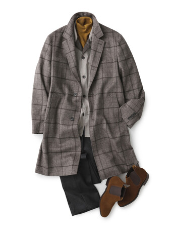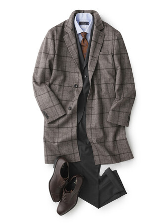 程よくウォーム感のあるオーバーペイン柄セットアップと合わせた英国ムード漂うビジネススタイル。ジャケットの裾が隠れる絶妙な丈感なので、ビジネスシーンでの着用もおすすめです。