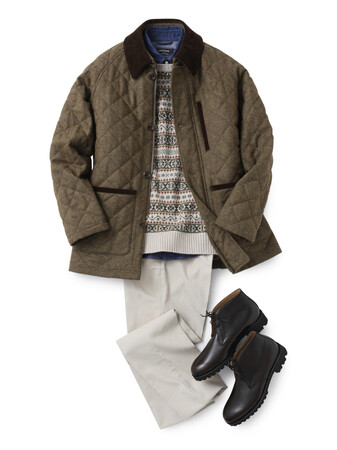 6オンスの中肉デニムシャツに、クラシカルなフェアアイル柄クルーネックニットをレイヤードして季節感のある装いに。男らしさとマイルドなイメージを両立したアイテム使いがポイントです。