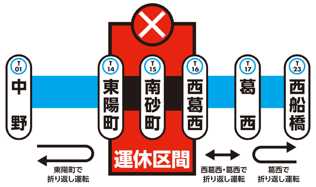 工事期間中、東西線は東陽町~西葛西駅間で終日運休するため、東陽町駅及び葛西駅での折返し運転を実施します。また、西葛西~葛西駅間は、同区間での折返し運転を行うため葛西駅でのお乗り換えが発生します。