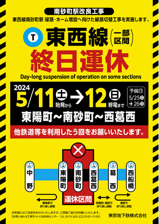 東京地下鉄株式会社(本社:東京都台東区、代表取締役社長:山村 明義、以下「東京メトロ」)では、東西線南砂町駅の線路・ホーム増設へ向けた線路切替工事を実施するため、2024年5月11日(土)~5月12日(日)の2日間、東西線東陽町~西葛西駅間を終日運休します。 ※悪天候等の事情により、線路切替工事を実施できない場合は、2024年5月25日(土)~5月26日(日)に延期します。