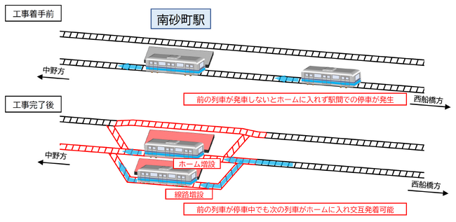 本工事は、東西線の輸送力増強を図るため、南砂町駅の線路とホームを増設するものです。工事の最終完成後は、同一方向の列車が交互に発着することが可能となり列車遅延の防止やホーム上の安全性向上を図ります。