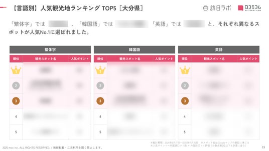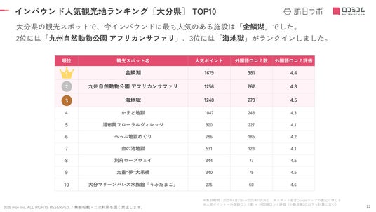 業界最大級のインバウンドビジネスメディア「訪日ラボ」及び 店舗向け集客一元化プラットフォーム「口コミコム」を運営する株式会社mov(代表取締役:渡邊 誠、本社:東京都渋谷区、以下mov)は、大分県の観光地に寄せられた最新の口コミデータから、独自の『インバウンド人気観光地ランキング』を発表しました。