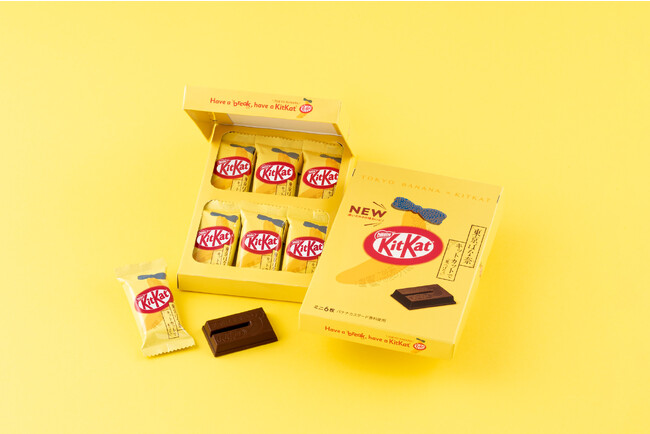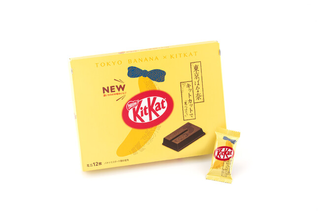 「東京ばな奈」の特徴であるしっとりしたクリームを、本品ではウエハース層間のクリームをなめらかにすることで表現。従来の「キットカット」にはない、しっとり感とサクサク感のコンビネーションをお楽しみいただけます。そして、厳選したバナナパウダーを配合することで「東京ばな奈」らしい優しいバナナの味わいを表現しています。さらに、チョコレートの表面にはコラボレーションを象徴する、かわいいバナナの形を刻印しています。その他、箱も「東京ばな奈」らしいデザインと形状を採用し、今回の取り組みを最大限表現しています。