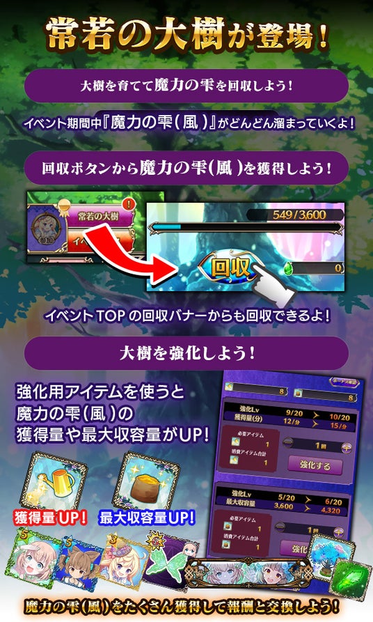 イベント期間中、時間経過で「常若の大樹」に「魔力の雫(風)」が溜まっていき、回収することで「魔力の雫(風)」を獲得することができます。