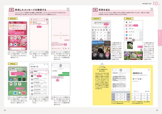 iPhoneとAndroidの両方に対応しており、タッチ操作の基本やホーム画面の見かたから、スマホならではの文字入力の方法、そしてアカウントやアプリといったスマホ特有の概念まで、初心者にもわかりやすい形で日々ステップアップしながら学んでいけます。