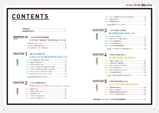 本書は、30日分の講座スタイルで、基本から応用までステップアップしながらスマホの扱い方を学べる構成を採用しています。わかりにくい箇所には専用の無料解説動画も用意されており、誌面で紹介している操作手順を実際のスマホで試しながら追っていくことで、日々の課題をより深く理解できる仕組みになっています。1日15分程度×30日分の講座を通して、初歩的なスマホの操作方法からインターネットやメール、LINE、さらにはスマホ決済やネット通販、健康・服薬管理といった実用的な使い方まで身につきます。