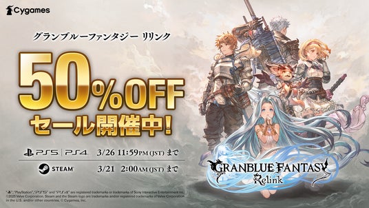 ゲームの企画・開発・運営事業を展開する株式会社Cygames(以下、サイゲームス 本社:東京都渋谷区、代表取締役社長:渡邊耕一)は、アクションRPG『グランブルーファンタジー リリンク』について、Steam(R)版、PlayStation(R)5/PlayStation(R)4版のセールを開始したことをお知らせいたします。
