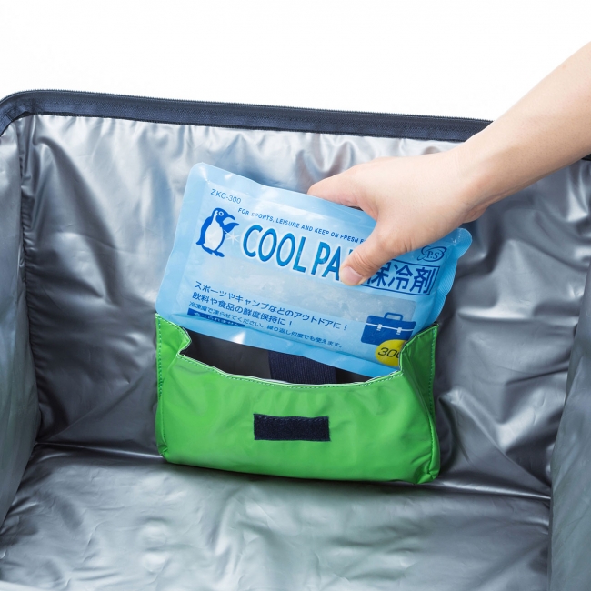 収納部は大容量の60リットルサイズで、幅510×奥行き410×高さ300mmまでのものを収納できます。「ゆうパック(箱・大型)」や「クロネコボックス(10)」などの運送会社の各種定型荷物サイズに適応しているほか、A3サイズ書類や24本入り缶ビールケース×2個、2リットルペットボトル9本ケースなども受け取れます。収納部に用意されたポケットに冷却材を入れておけば、暑さに弱い配達物の受け取りも安心です。