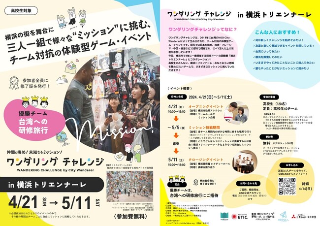 ワンダリングチャレンジは、2013年に台湾のNGO City Wandererによって生み出された、チーム対抗の体験型ゲーム・イベントです。現在では日本を始め、台湾・マレーシア・中国・香港など22都市で開催され、のべ1万人以上の若者が参加しています。今回は、横浜市で3年に一度開催する現代アートの国際展『第8回横浜トリエンナーレ「野草:いま、ここで生きてる」』と共同で開催します。高校生のみなさんには、横浜美術館があるみなとみらい地区を舞台に3人1チームで、さまざまなミッションに挑んでいただきます。