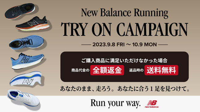 株式会社ニューバランスジャパン(本社所在地:東京都千代田区、代表取締役社長 久保田伸一)は、記録にチャレンジする人、自分のペースで楽しむ人、すべてのランナーを尊重し、それぞれの走りを応援する想いを込めて、「New Balance Running TRY ON CAMPAIGN(ニューバランスランニングトライオンキャンペーン)」を開催します。9月8日(金)~ 10月9日(月)のキャンペーン期間中に対象商品を対象店舗にてご購入いただき、シューズに満足いただけなかった場合、商品代金の返金と返品時の送料が無料となるキャンペーンです。