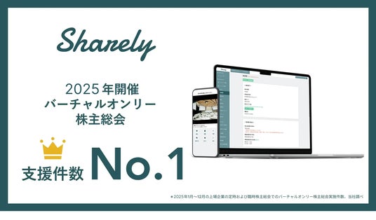 Sharely株式会社(本社:東京都港区、代表取締役:西條 晋一、以下「当社」)が提供する株主総会総合支援サービスの「Sharely(シェアリー)」は、2025年に開催された上場企業のバーチャルオンリー型での株主総会(※1)で、支援件数において、シェアNo.1を獲得したことをお知らせします。