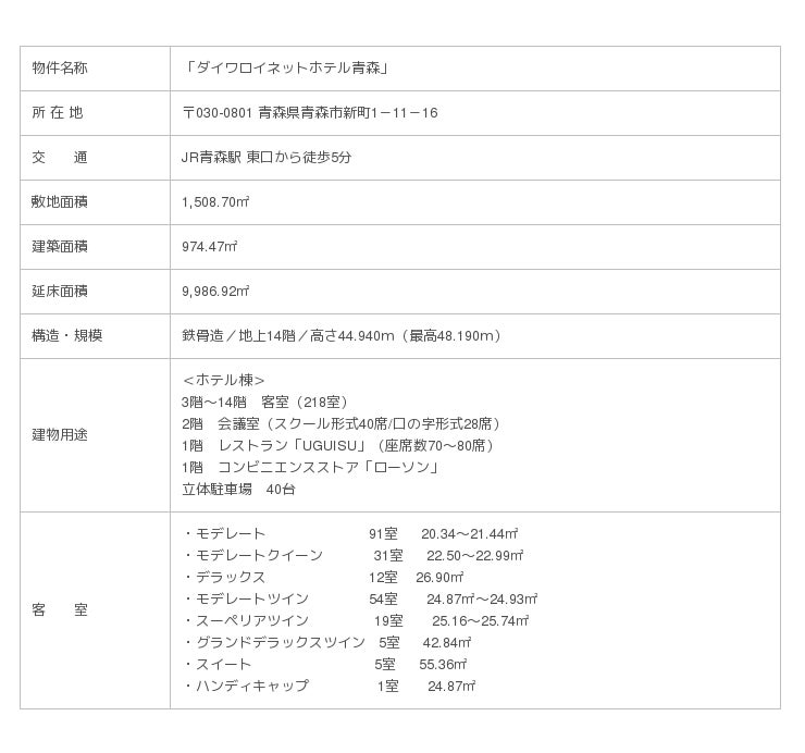なお、当ホテルのオープンにより、当社が運営するダイワロイネットホテルは全国で50ヵ所目、青森県内では「ダイワロイネットホテル八戸」に続く、2ヵ所目となります。