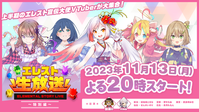 Studio Z株式会社(本社:東京都港区 代表取締役CEO:池幡 賢)が運営しております 共闘対戦 爽快パズル消しゲー『エレメンタルストーリー』は、2023年11月13日(月)20:00より、Studio Z公式エレスト生放送-特別編-を配信いたします。