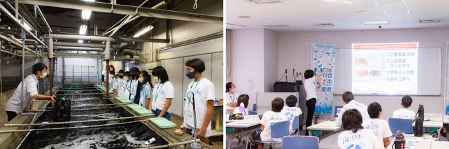 翌日30日は、志摩市の三重県水産研究所へ。ここでは近年のアワビの減少を防ぐ対策として、アワビの子供である稚貝にタグを付けて放流し、その稚貝がどのぐらい生き残ったかを調査・研究しています。職員によるスライドの説明の後は、研究所内の水槽施設に移動して、海の資源を守るための最新技術である栽培・放流などの手法について学び、子供たちは大きな水槽に興味津々の様子でした。また、研究所の人たちがどんな事に注目しているかを取材しました。