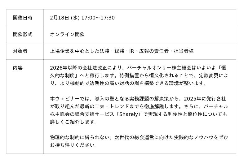 本ウェビナーでは、導入の壁となる実務課題の解決策から、2025年に発行各社が取り組んだ最新の工夫・トレンドまでを徹底解説します。さらに、バーチャル株主総会の総合支援サービス「Sharely」で実現する利便性と優位性についても詳しくご紹介します。