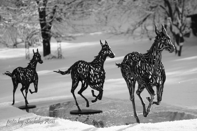 今回の展示では、長く厳しい冬がようやく終わりを迎え、命の芽吹きを感じる春に駆ける蹄の響きが聞こえるような等身大の馬の立体作品を中心に、北海道の自然や人の手の届かない自然の尊さを表現した浅井憲一氏の躍動感ある立体作品を数点展示いたします。