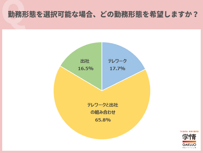 希望する勤務形態は、「テレワークと出社の組み合わせ」が65.8%で最多となりました。次いで、「テレワーク」17.7%、「出社」16.5%が続きます。「テレワークは働きやすいものの、毎日だとコミュニケーションが取りにくいと思う」「仕事内容に応じて、働く場所を柔軟に調整したい」「テレワークと出社を組み合わせることで、メリハリをつけて働けると思う」といった声が寄せられています。