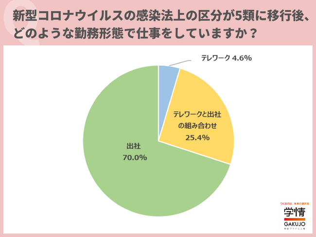 現在の勤務形態は、「出社」が70.0%で最多でした。「テレワークと出社の組み合わせ」25.4%、「テレワーク」4.6%となっています。