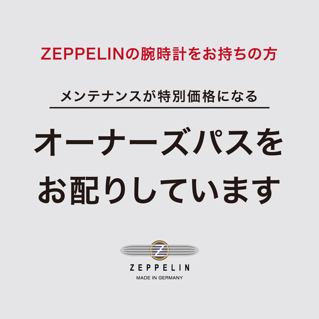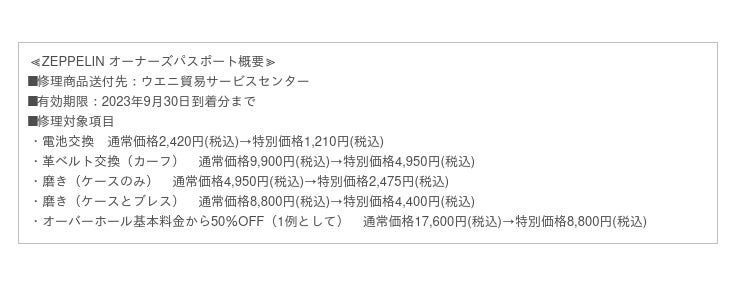 ZEPPELINの腕時計をお持ちのお客様に、有償で行っているメンテナンスを割引価格で受けられるチケットをプレゼント。本パスポートと保証書をZEPPELIN腕時計と同梱して以下記載の公認サービスセンターに送って頂くと、本パスポートに記載の各修理を特別料金にて提供させて頂きます。