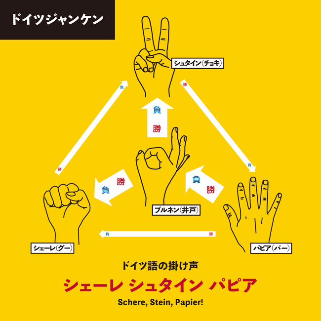 ドイツでは、「じゃん、けん、ぽん」の掛け声が「Schere, Stein, Papier!(シェーレ シュタイン パピア)」になります。また、「シェーレ(グー)」「シュタイン(チョキ)」「パピア(パー)」に加え、「ブルネン(井戸)」を出すこともできます。是非会場で覚えていただき、ドイツ式じゃんけんにチャレンジください。更に、負けた方もZEPPELIN公式LINEアカウントの友達登録でガチャに参加可能です。